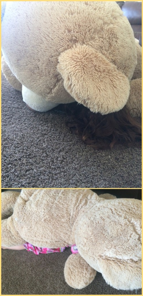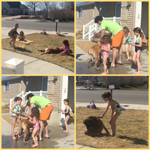 I eventually found her asleep under the big bear. 🙂 And the girls and Corom gave our dog “Kitty” a bath in this awesome weather we are having…
