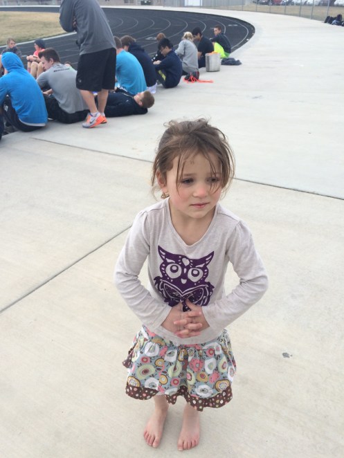 They made about $1 I believe. 🙂 I am thankful for the people that stop! I had to run off to track practice… About 20 minutes later I see my youngest (4 yrs old) running on to the track (barefoot). I realized it was just her! Yep… She ran about 1/2 mile from our house to the school without Corom knowing.