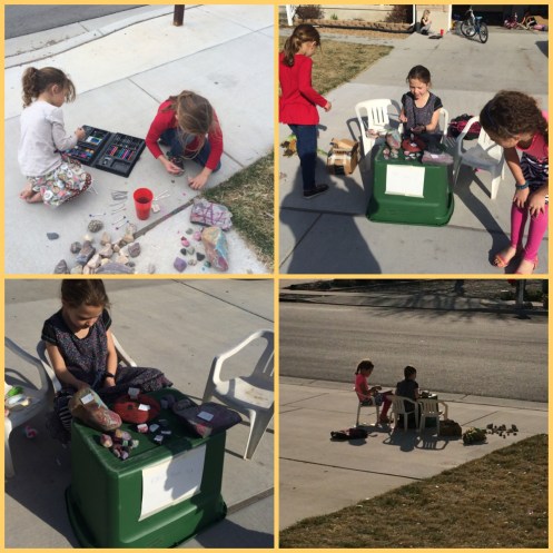 Shortly after, I headed for the temple (with 4 other friends) to do a session. It was great! Corom was off for the day so he agreed to pick up our 2 youngest from preschool and Kindergarten along with 2 other Kindergartener’s and another little girl from a different preschool. I know… Kind of a lot but that’s how it is. So he was nice enough to volunteer to do it, so I could go to the temple. Well…. I checked my phone when I got back into the car. Umm… 9 missed phone calls and 10-11 text messages… All from the school, preschool, office ladies, etc. Yeah… Corom took a little cat nap right around pick up time. He was only 20-25 min late picking everyone up! 🙂 The girls painted rocks and decided to sell them (for 1 penny).