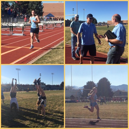 The top left corner is of a young man that signed up for the 4 x 2 mile. He has been training with the sprinters but he signed up to make it a full team to help the other 3 distance runners. 🙂 (Today all the freshmen/sophomores raced, while the varsity field events took place… Tomorrow it’s opposite.) You can see the coaches are hard at work… 🙂 We were actually by the javelin throwers (helping with that event) with some of our female javelin/field eventers (if that is even a word) warming up with hand stands… Or something like that. At home, Corom and I sat down with the girls and watched a movie… A late night for them. 🙂 Now it’s time for bed for me!