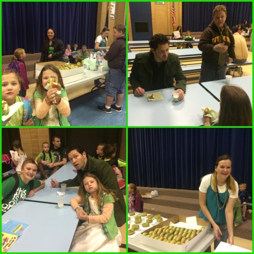 Tuesday: I had to do a speed workout of 9 x 800’s. :/ Jeff was able to join me… It helped a lot. We ran a 2 mile warmup and then began the 800’s on the road (the 1st 350 with a 1% downhill). It helps get the leg turnover going. Our 1st was a 2:33, 2nd: 2:34, 3rd: 2:35, 4th: 2:38, 5th:2:38, 6th: 2:37, 7th: 2:38, 8th: 2:35, 9th: 2:32. We finished with a 2 mile cool down… Totaling 13 miles. The 1st 2 800’s were fast. Too fast… I knew I had to slow it down because I did not want to be dead for the last 3-4… I, surprisingly felt really good doing this workout. It did help having someone to chase and pace off of! Back at home, it was the hustle of getting kids ready for school (for St. Patrick’s Day). We have so much going on today at the school that I needed to be there an hour early… (I usually take 3 kids to school everyday, so they, too, were ready to go early). We (The PTO-PTA) had green donuts and milk for the kids (and parents if they were able to make it)…