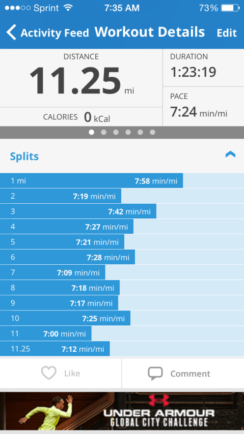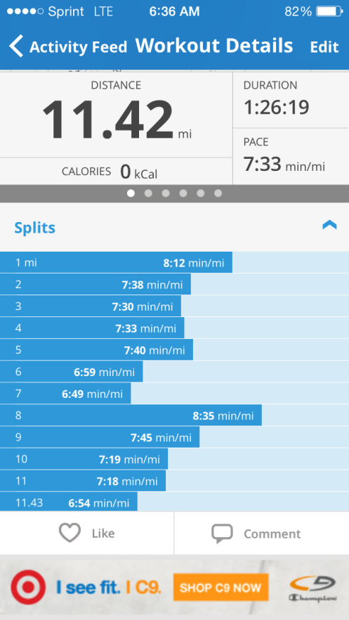 Saturday: I set my alarm for 4:45 a.m. On a Saturday… We have a huge invitational track meet today and the bus leaves at 6:30. I decided not to take the bus, so I could get a decent run in, shower, etc and then make the 30 min drive to the meet (mile race starts at 8). So I went out for a little over 11 easy miles…
