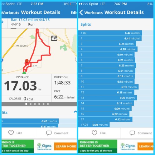 Saturday: My alarm went off at 5:15 a.m. Not happening this morning! I decided to sleep in. We attended a baptism at 8 this morning and then I went for my 17 miler at 9. I decided to try out music for the 1st time ever in my running career. 🙂 Holy Crap! Where have I been? I loved it!!! I didn’t realize how fast I was going until I was done.