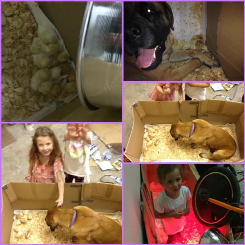 Somehow they ended up at the tractor store and bought a bunch of baby chicks for us to raise. Awesome!!! Let me just say that I was a little surprised to come home to that. Our dog, Kitty, loves the chicks. She just jumps right into the box as if they were her babies!