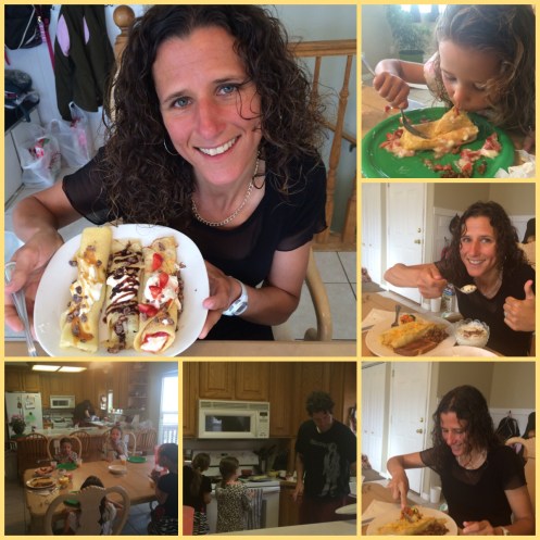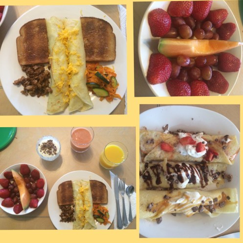 It was simply amazing and I was so full by the time I was done. He made crepes (with sausage and sautéed vegetables), fruit smoothie, fruit bowl, Yogurt with chocolate chunks, toast, orange juice and then 3 dessert crepes (chocolate, caramel & whipped cream with strawberries). Oh it was heaven! And I ate 95% of it.