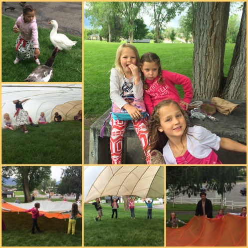 Shortly after the graduation ended, Corom, the 2 younger girls, 2 neighbor girls (I am watching for the afternoon), and I went with the 1st graders (my 2nd daughter) on a little field trip to the local park/pond. Corom walked with the 1st graders and the younger kids and I drove… I had to drive the parachutes to the park for the teachers. The kids had a lot of fun!