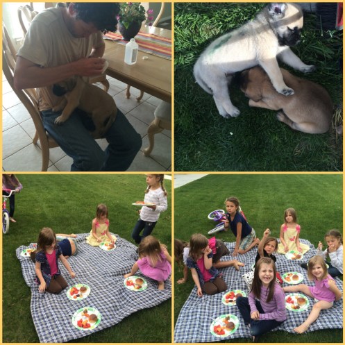 We went to a friend’s house for dinner. But just before that, Corom gave the puppies their shots. We had one of the puppies go to his new home (they are 6 weeks old and the guy really wanted the puppy now to start training it). 🙂 I was actually sad to see it go! So now we are down to 2. Anyway… It was nice to go to our friends for dinner. We had a good time (they have 5 girls very similar in age as our girls).