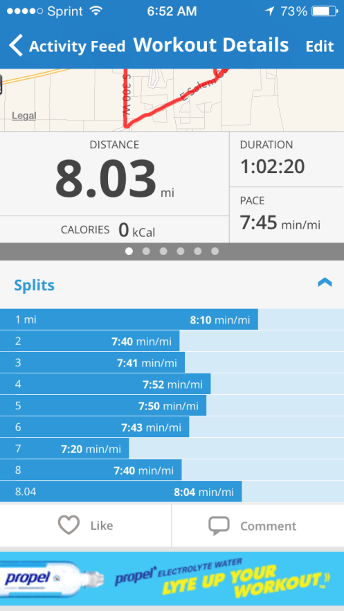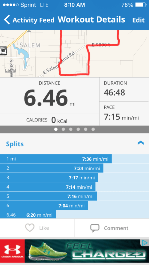 Friday: I only had to do a 6 mile run today! Loved it!!! I slept in until 6:45ish and then headed out.