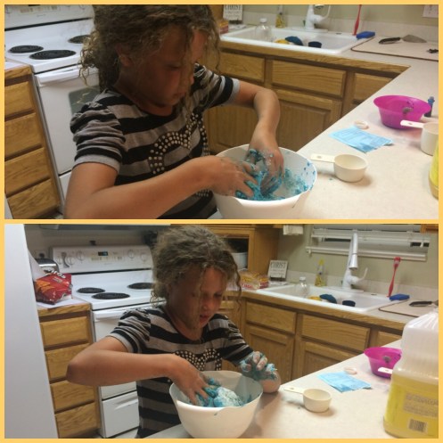 We came home late and as I was putting the girls to bed… My oldest informed me that she had to bring in homemade blue play dough… What’s one more thing, right?