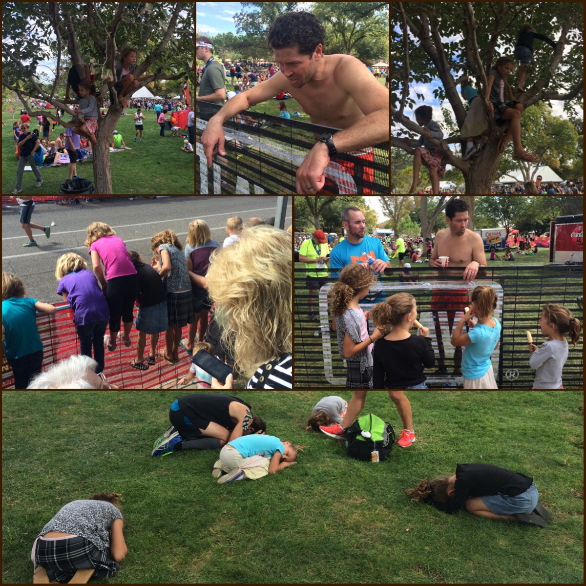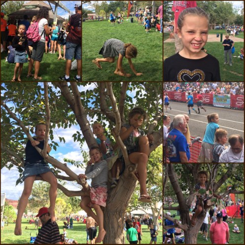 I didn’t know what time to expect Corom and Mike in, so I wanted to make sure we got there. We had a smooth car ride and by the time we got to the finish line area (parked and everything) it was 10:45 a.m. The girls kept themselves very entertained while we waited… It was fun to watch them climb up the tree like it was nothing, as these boys were trying to follow with no success. 😉