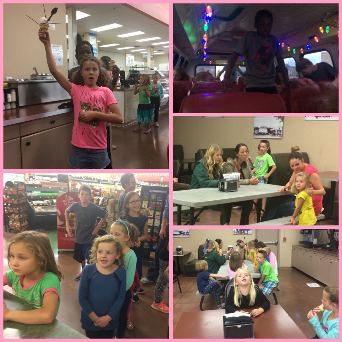 For family night, Corom, the girls and I loaded up on the bus and went around picking up neighbor kids and families. There were about 21 extra people that came with us. 🙂 It was a little chaotic!!! We headed to our local grocery store and ordered ice cream cones…
