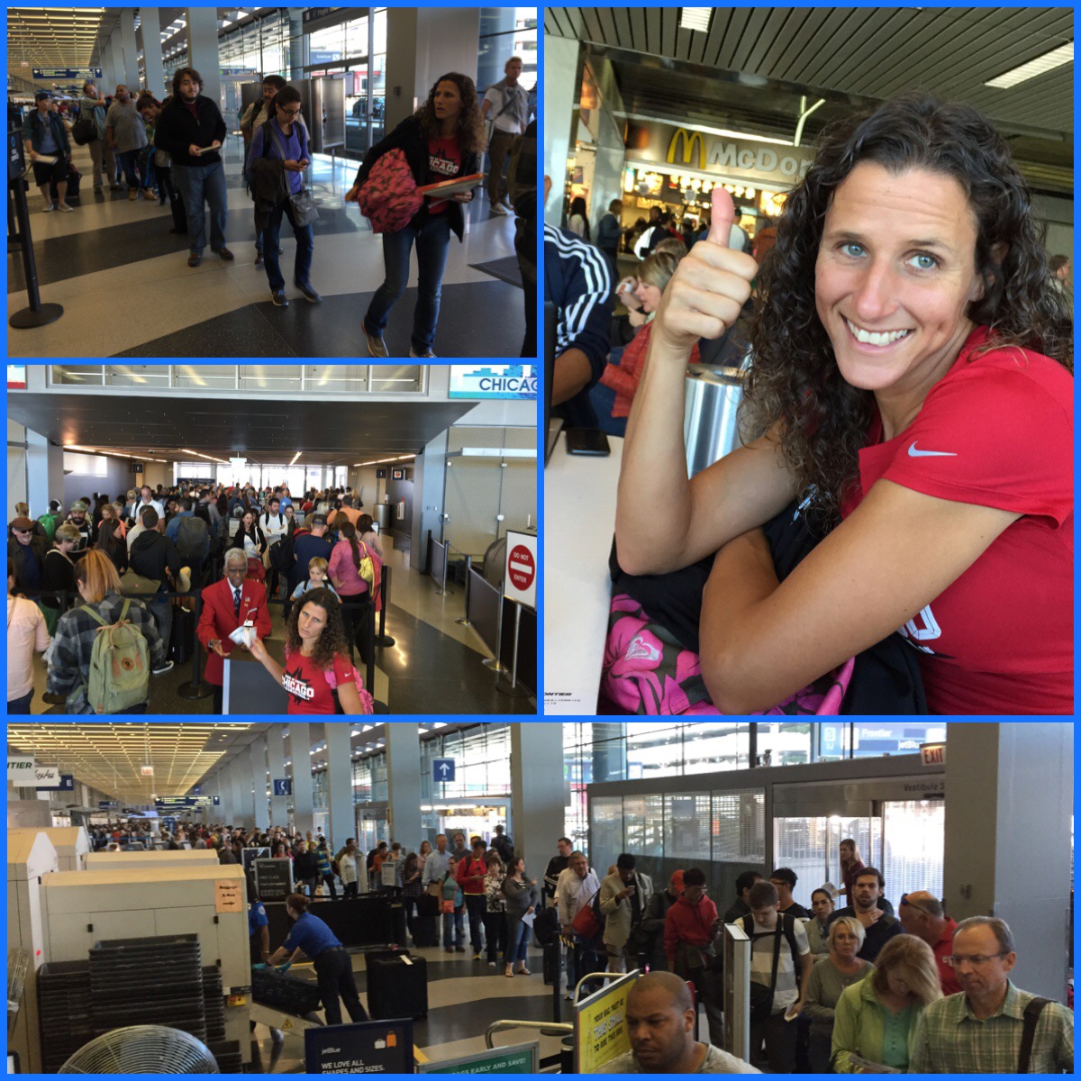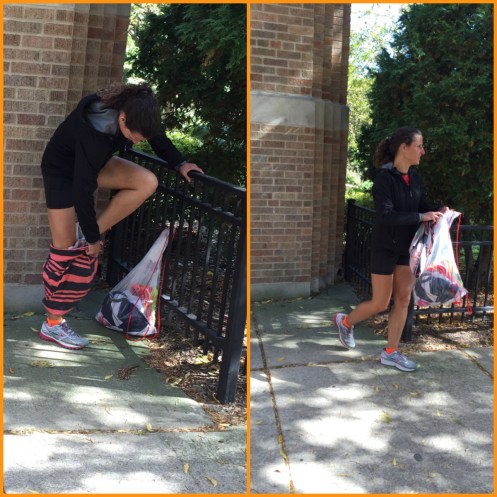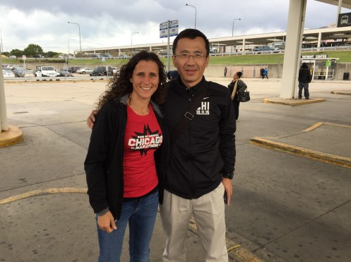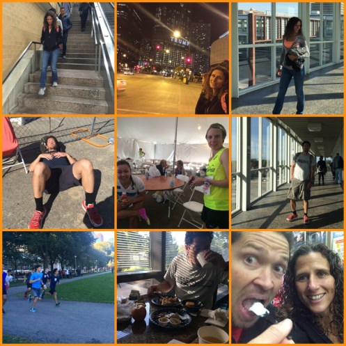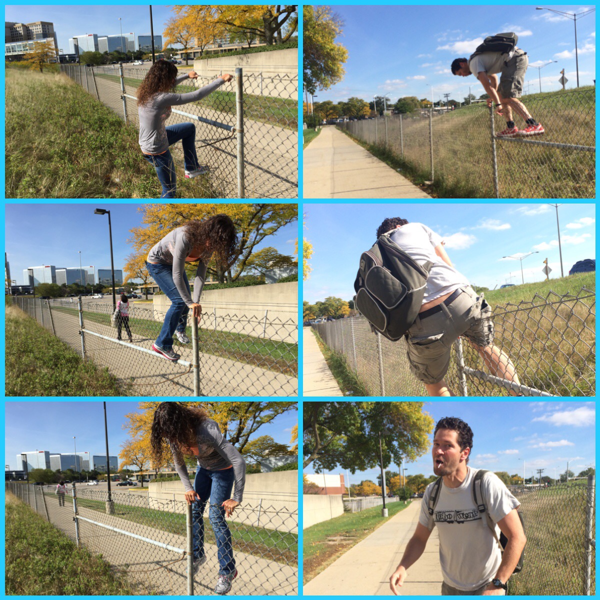 We ate a great breakfast at the hotel (met a lot of runners from around the country and world). Chicago marathon I guess is kind of a big deal. 😉 We decided to walk to the train station (instead of taking the shuttle there). We took the wrong sidewalk and ended up on the freeway… We ran down the field and hopped the fence. Corom fell and hurt himself. I could not stop laughing! So funny.