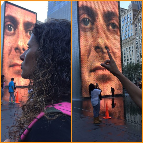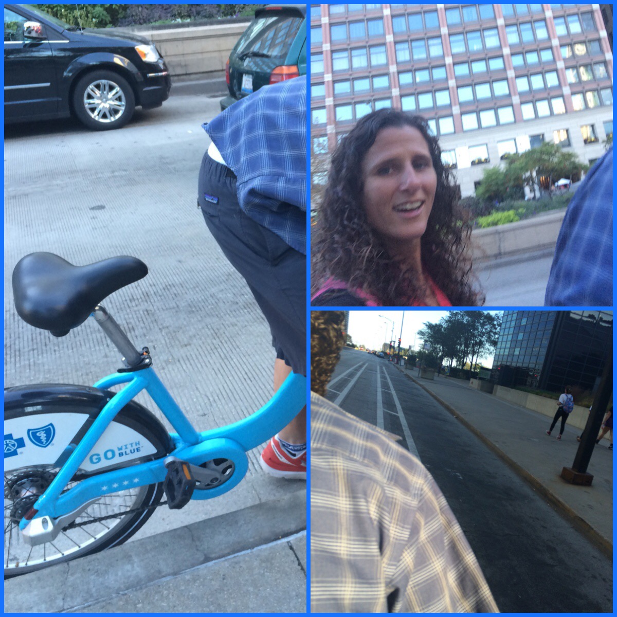 We left when sacrament meeting was over, so I changed…  We headed back to Abbeys and Ryan’s place for a quick shower… We all went out to dinner (our treat for taking us in). It was the least we could do. They were a fun couple.   Corom and I walked around for awhile. We had to see the famous Chicago Bean…  Then we had fun with this guy here… He was a good kisser!   Corom still had his rental bike from the race earlier… Instead of paying another $10 for a 2nd bike, he had me sit on the seat while he stood and pedaled. We had so many looks… Probably jealous that they paid for an extra bike. 😉 Corom rode hard while I had to hold my legs in the air. I think we were both struggling but laughing so hard. Well I was laughing while Corom was breathing hard.