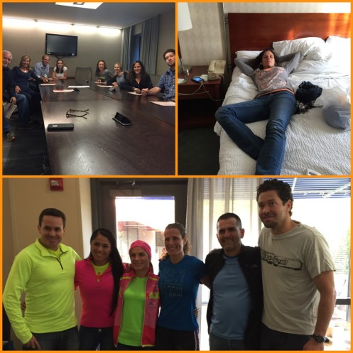 We decided to go to a movie to be able to relax. I wanted to take my mind off of the race. We ended up at this really nice movie theaters. We were already a little late (20 min late), so we quickly ran in. We didn’t see anyone at the ticket booth and decided to go into the movie. We soon realized we had the balcony seats to ourselves. Yes, at this point we didn’t pay. We watched the movie (Martian) first and as we walked out realized that we went through a VIP door. We did go to the correct place to pay for our movie after. The ladies were confused when Corom kept trying to buy a movie for the 11:00 a.m. Showing when it was almost 2. I will say he messed around with them but that wouldn’t surprise anyone that knows Corom. They were grateful that we did come back to pay… We shared a hamburger from Kings restaurant and then headed back to our hotel. I am getting way nervous!   I was able to get a 20 minute catnap in. I put the headphones in, listened to the piano guys and nodded off. We packed our things for the night and all my race stuff, then headed into downtown to be closer to the starting line. We met up with Janae & Ken, Kathryn & Bill MacLeod, Emily Jameson & Jasmine Sessions for a “Utah” dinner. Janae, Emily and Jasmine are also trying to Qualify for the Olympic trials. It was nice meeting up with friends from home. (None of us made it but we all had fun.) The restaurant sent us to the business conference room… We had a pretty good laugh! I ate chicken parmesan… So good!  The group below these 2 picture was a Costa Rica team. They are staying in the same hotel we are staying in. We became friends with them pretty quickly. Corom served his LDS mission in Costa Rica. We will be going out there soon… They want to meet up and take us around on their running routes. They were a fun group.  After dinner, Corom and I made our way across the city to Abbey & Ryan’s house. We have never met them… My friend Stephanie knew Abbey through her Jamberry (nails) business (they have never met in person, either). Abbey and Ryan volunteered to take us in after a post Stephanie posted on Facebook. 🙂 They were awesome! That is something Corom and I would do. I slept well there and had a nice early morning wake up alarm…
