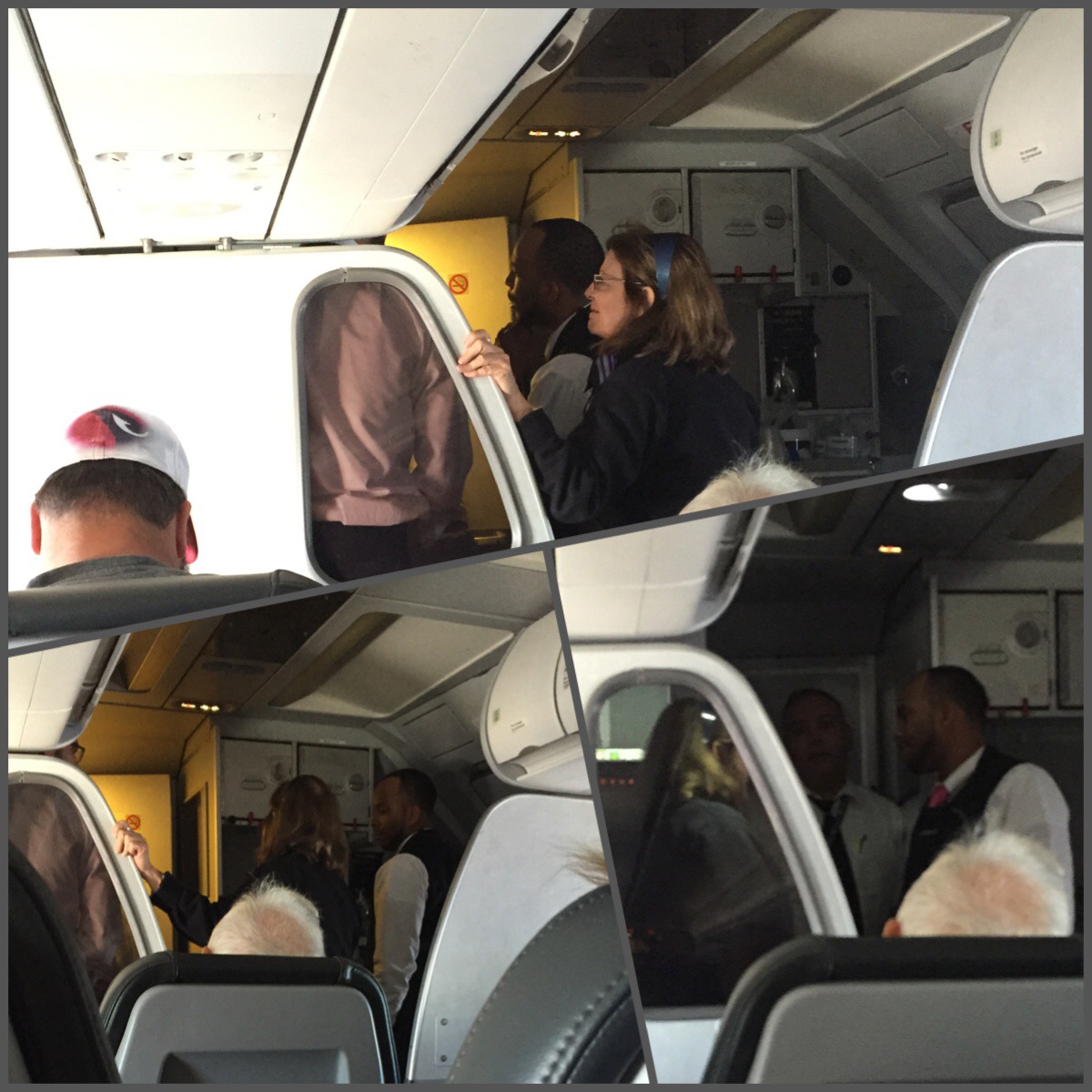 We packed and left for the airport… The fun times of traveling back home. The airport was so crowded and busy. It made me a little stressed. You have Corom here who could care less about anything… He was making fun of me and taking my picture. Yes that irritated me even more. 😉 I am smiling in this picture because we finally made it to our gate after 40 minutes of the security check line.   On our flight (with about 1 1/2 hours to go), you see all the flight attendants and then one of the pilots come out. The smoke alarm went off up front (just a warning alarm). I will have to admit I was a little uneasy and tried to pick up on what they were saying. Well I guess someone went into the bathroom to have a little smoke… Yeah Not so sneaky!