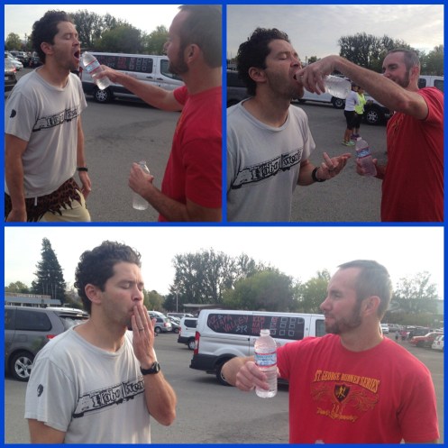 I don’t think Corom ever put the megaphone down except for when he was running… He may even slept with it (poor Tifany and Ashley… I think they probably felt Corom was running with them the entire time with the megaphone in their ears).  Mike was able to scrounge food off of another Ragnar team and Garrett when he was behind the wheel had to burn out every time. πŸ™‚ We did get about a good 4 hours sleep total (8 p.m. to 10 p.m. And then from 4:30 a.m. to 6:30 a.m.). Throughout the race we had a little thing about what bottled water was better… I have never even thought about bottled water tasting different but apparently there is a difference. So of course we had a water tasting test…
