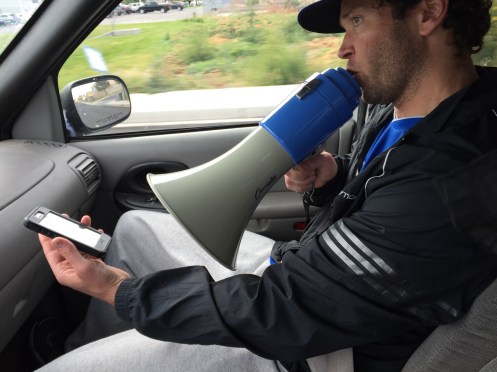 Saturday: Today is a big day for us. Lots going on! I got up at 4:45 a.m. to get my long run in. I couldn’t find my garmin and I didn’t have time to find it so I just ran for time (about 2 hours). I went straight to the HS to set up for the 5k race this morning, then ran home to get Corom, the girls and the 2 Japanese boys. No surprise here… Corom has his megaphone in hand giving out a cheer right before the race started…