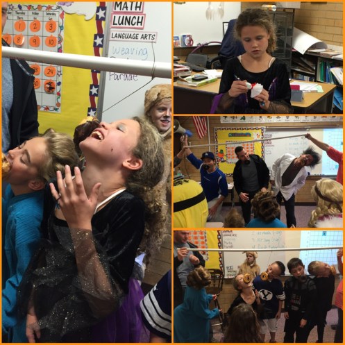 For my oldest’s class, we did do the crafts along with a donut eating contest. 🙂 Of course we had their teacher, Corom and another dad show the kids how it was done. As you can see, Corom still has his megaphone in hand.