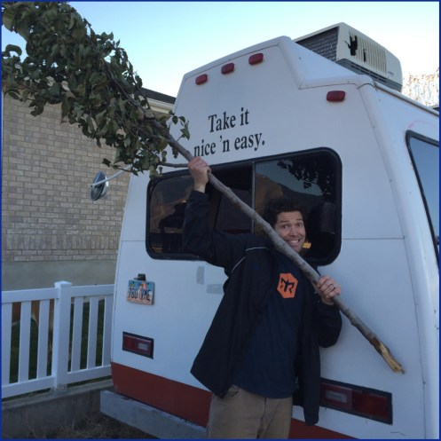 Corom did hit a plum tree and broke it in half, when he was backing the bus up. Of course it had to be a sheriff’s and a sheriff that he works with. Out walked the sheriff’s brother in law and it was a guy that served a LDS mission with Corom (in Costa Rica)… What are the odds!