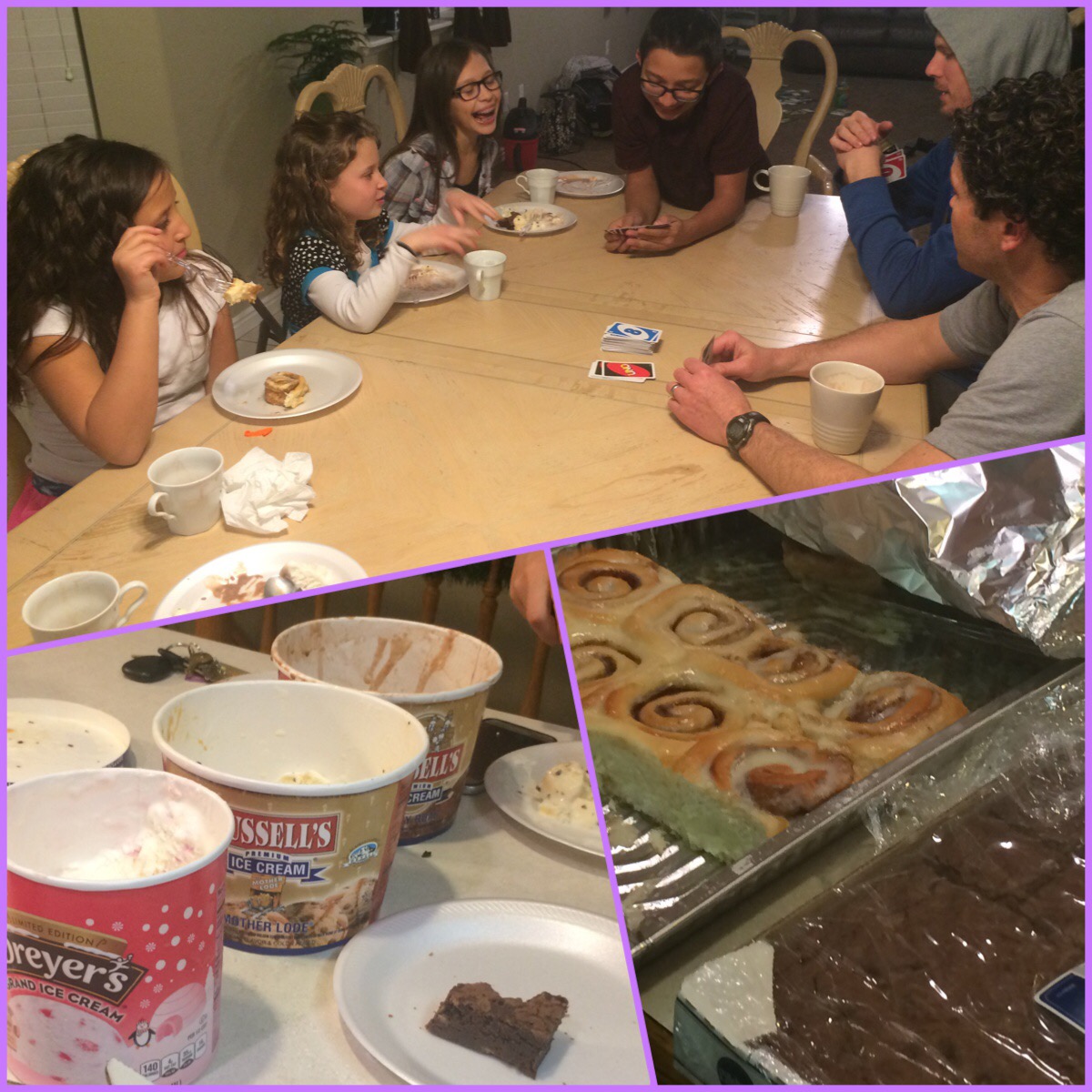 We had a family over for dinner and another family joined us for dessert after… We had left over cinnamon rolls, brownies and hot chocolate, oh and ice cream!