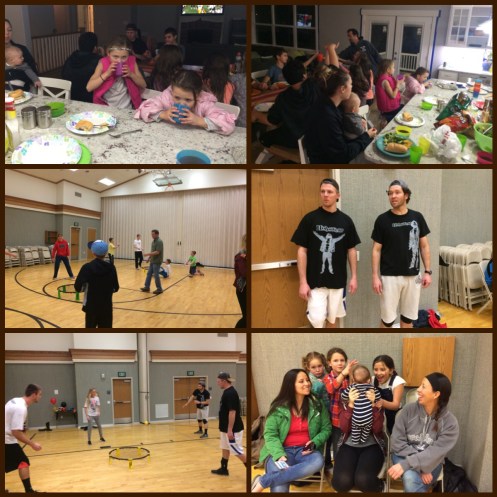 The 2 younger girls and I went to the Chase’s house for dinner and then to the church to play Spike Ball with many others. Corom and Travis were a little into the game with their matching outfits and all.