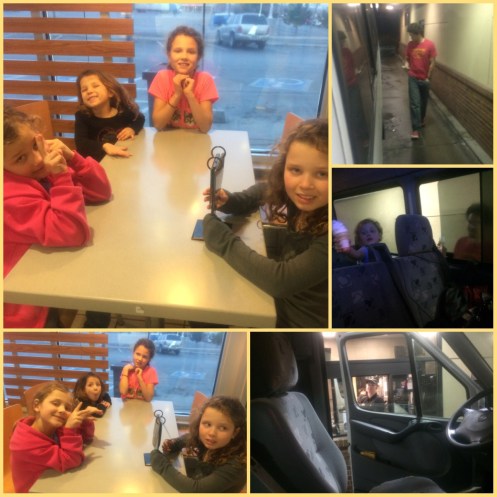 We began our wonderful drive back home. All I will say is that 70% of the time, we could tell the girls were tired from a long, late night weekend. The other 30% of the time it was a pleasant drive. We stopped at good old McDonald’s for dinner and then a little while later stopped at another McDonald’s for ice cream cones. 🙂 (Our van was too big to go through the drive thru so Corom walked through it.)