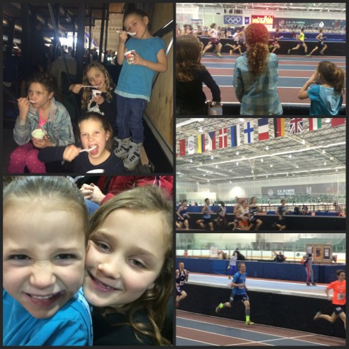 I went straight from that to grab the girls from school and we all headed up to the Olympic Oval (a skating rink with a track around it) for an indoor track meet. The track is longer than a 400 (425 I believe). So we watched the HS kids race on the outside of the skating rink,