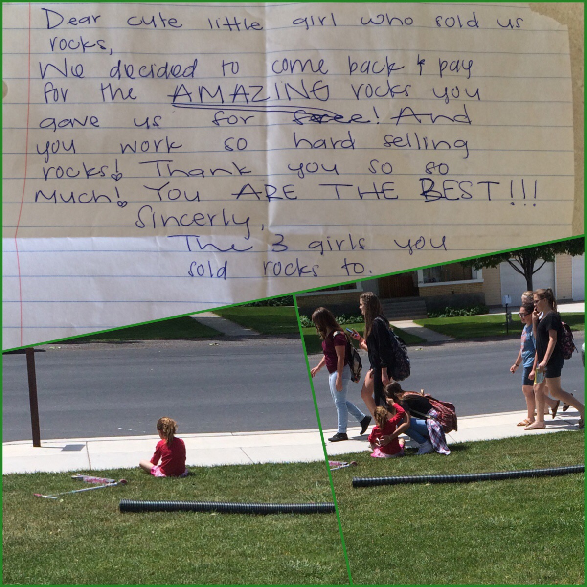 Service:  There are 2 separate incidents that I want to write about! First one… Selling Rocks: On the last day of school my youngest daughter (just finished kindergarten) went out to sell rocks to the Jr high kids as they walked by our house. I have never witnessed something so amazing and kind from many different groups of Jr High aged kids. 90% of the kids would stop and acknowledge my daughter. They would engage in conversation. They would give her the change they had on them in exchange for a rock and if they didn’t have money, they would give her something from their backpacks or just talk with her. There was one group of girls that came by and they said they had no money. So my youngest just gave them each a “free” rock.  We left shortly after to pick up my other girls and when we came home, there was a note on the doorstep with a dollar or two in change from the darling group of girls.