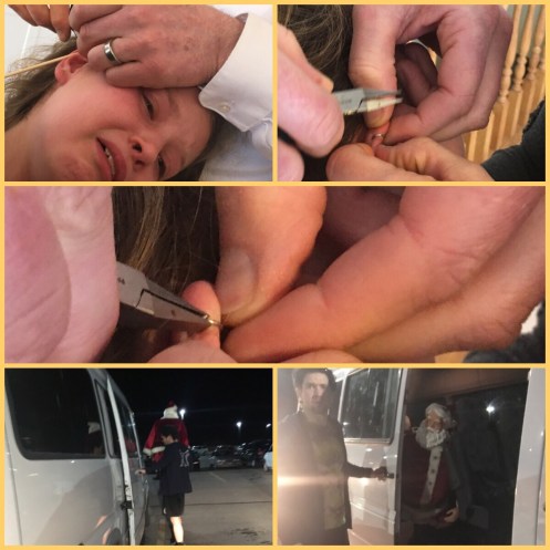 Being the genius Corom is… my 2nd child wanted to put a pretend earring in the top of her ear, so corom helped her clamp it down. Well it was a little to tight. It was a good 20-25 min trying to get that little metal thing off her ear and it was painful!! The bottom 2 pictures, a group of high school kids borrowed our big van for a dance… we wanted to scare them by placing a life size Santa in the van. During the dance we snuck it in. Yes it did scare them. 😊