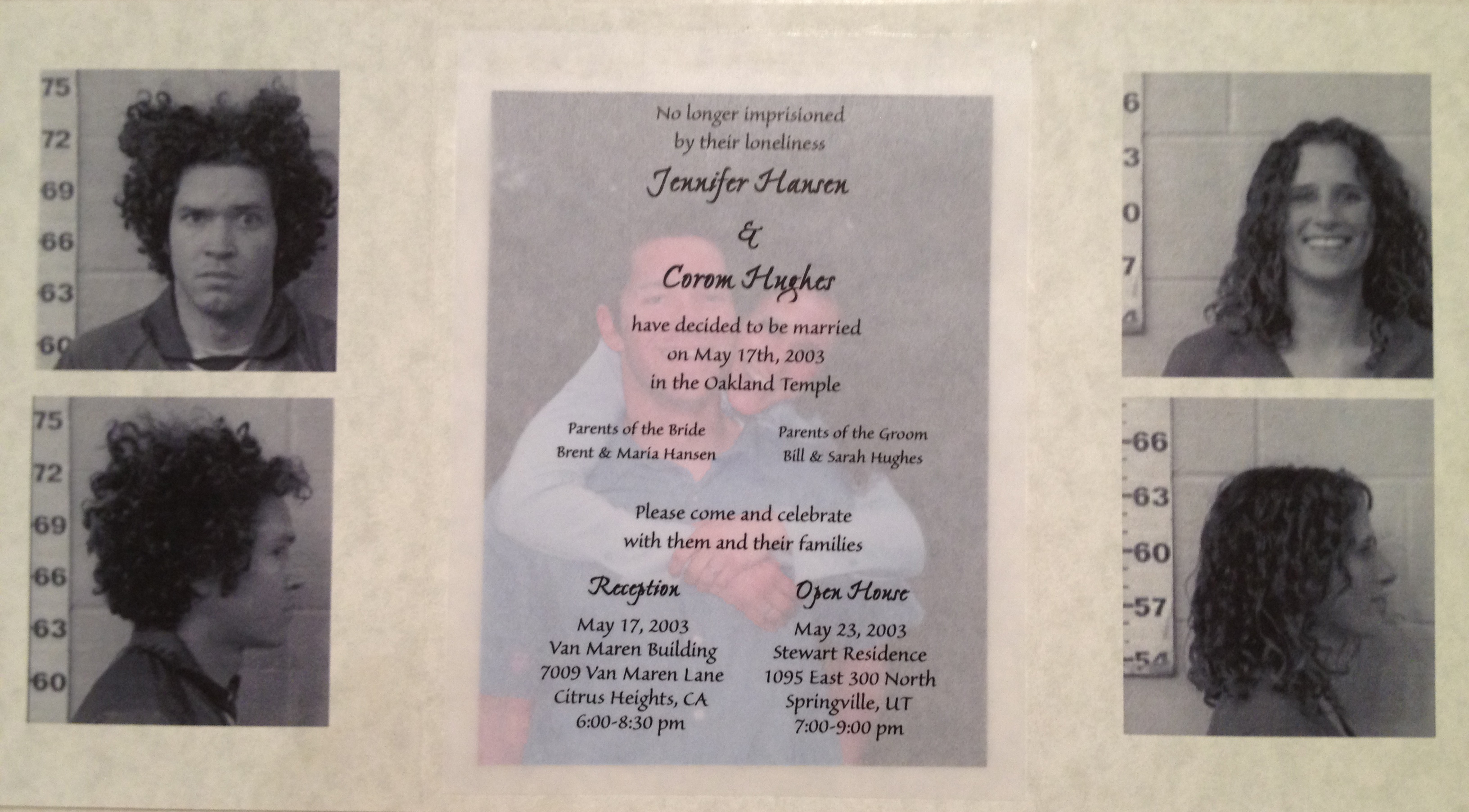 handcuffson me and put me in the back of his police car. I was a little freaked out. The officer was nice though, and was reassuring me that my boyfriend would come bail me out and it would be okay. The other officer ran Corom’s license (just a standard procedure) and of course another officer shows up. Corom ended up having a warrant out for his arrest for an unpaid speeding ticket 2 years prior to this night. He was handcuffed and put into a police car next to mine. We were both rolled up and taken in. We had the token mug shot photos, I had to strip down and put on one of their orange jump suits and we had to go in seperate cells. He went into one with the bars prison_cell1and I was put in a cell where I could not see anything (at least I was in there by myself and it was padded). Between the 2 of us, we had enough money to bail Corom out. This money was all in quarters that Corom had won on the way to Sacramento at Boom town in Reno. He gave it to me as a stocking stuffer (I have a weird feddish with loose change). Corom then headed out on foot because our car was impounded (and it was about 3 a.m. by now). He walked around until he found an ATM. (We also called his cousin, Dan, as we were getting arrested and he just so happened to be on his way to Sacramento from Utah.) His cousin found him about 4 a.m. and drove him to get $. Back at the jail, the officers behind the counter told me over and over that they see this all the time. The girlfriend bails the boyfriend out and he never returns. Oh great, I thought. Do I really know Corom? Well, when I finally did get bailed out and I saw that it was Corom, I knew that he was a keeper!!! Amongst all of this chaos the deputies gave me some free time out of my cell and in the process I was able to talk the deputies into letting me keep the beautiful mug shots. So we figured we would make the best out of the situation and the $1,000 loss and use the mug shots for our wedding invitation (which was unknown until 5 days after the fiasco when Corom proposed. He must have thought I was a keeper too!).