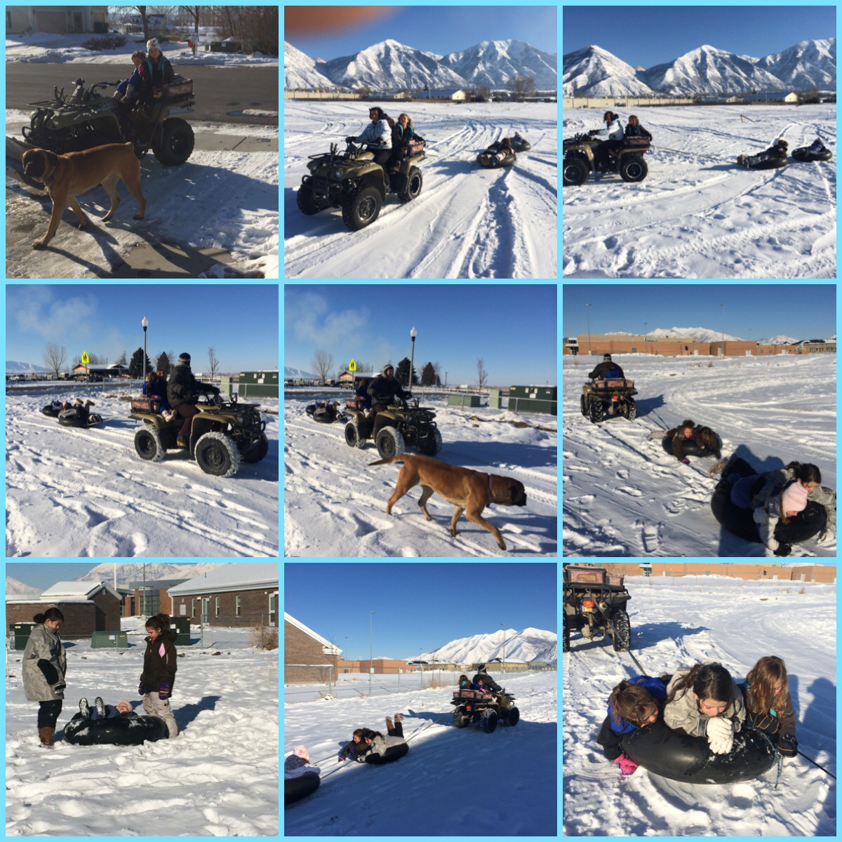 Thursday: New Years today… I started off my new year with an 11 1/2 (maybe…. I’m guessing) mile run up Harry’s hill loop. It was cold but a good run! Mac, Amber & Jeff joined me for this run. Good times. We cleaned for the 1st part of our day and the afternoon, the girls played out in the snow. We used a neighbor’s 4-wheeler to pull the girls around on tubes.