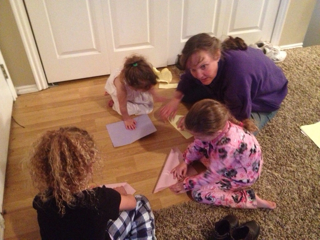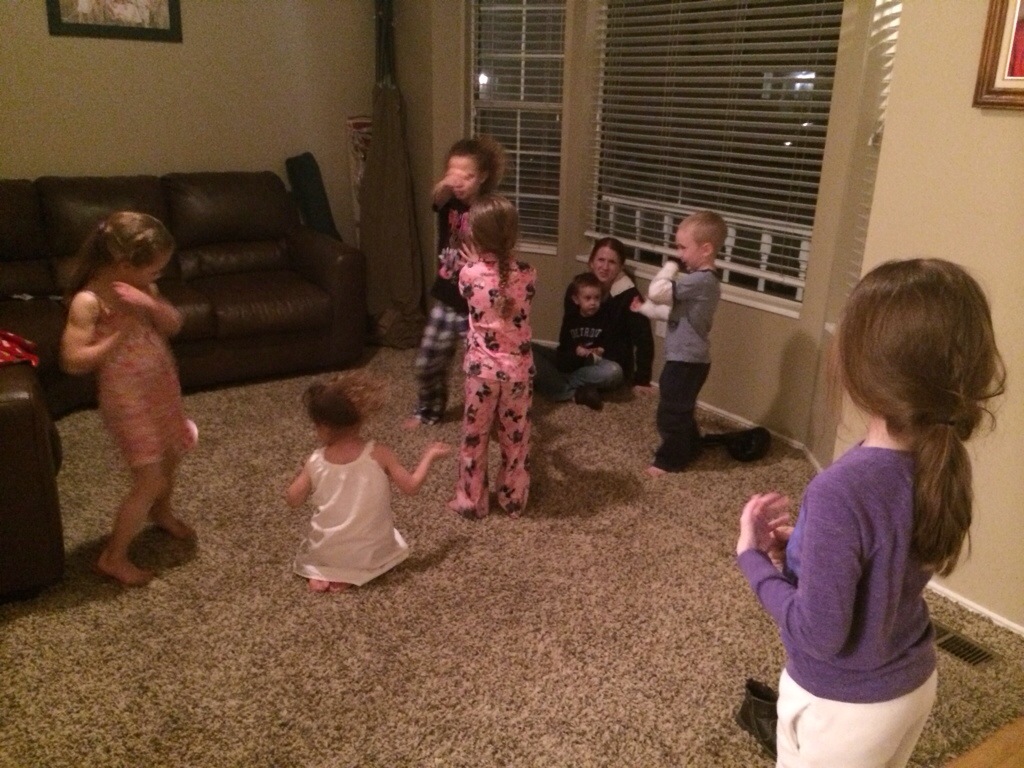I received a text at 4:30ish asking if I could feed dinner to a couple of young men (Mormon missionaries that are serving in our boundaries) at 5. I said sure send them on over (we were actually having a few people over anyways but not until a little bit later). I left practice at a quarter to 5 and began the process of getting dinner going, quickly. I did warn my neighbors (the Dych’s family) that I had missionaries coming over because they are not the same faith. They didn’t mind and understood the situation (just as long as they were not going home with a Book Of Mormon ;)). 2 other ladies came over (Mary and Siri) for dinner and Family Night. Siri did a little activity with all the kids. It was cute.