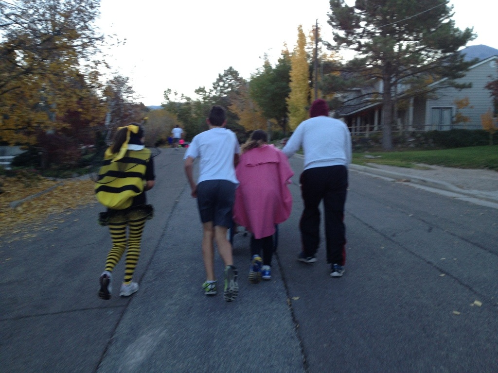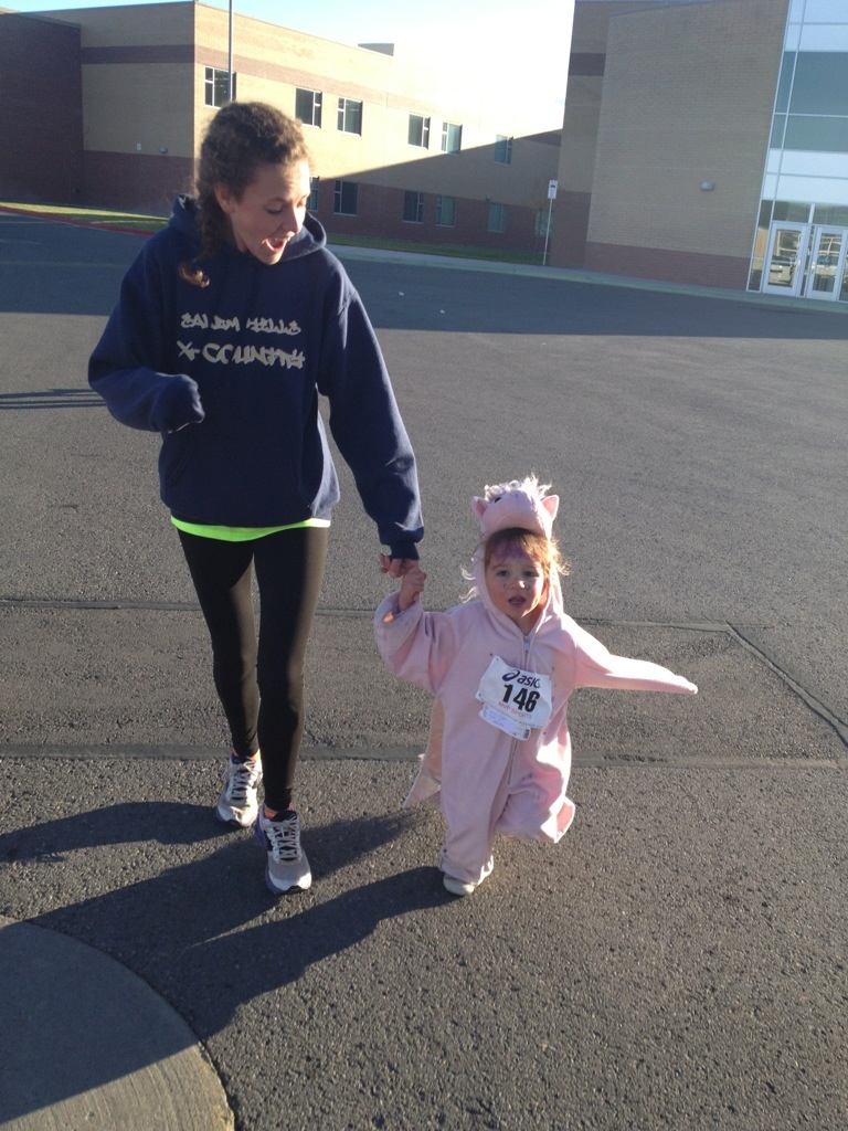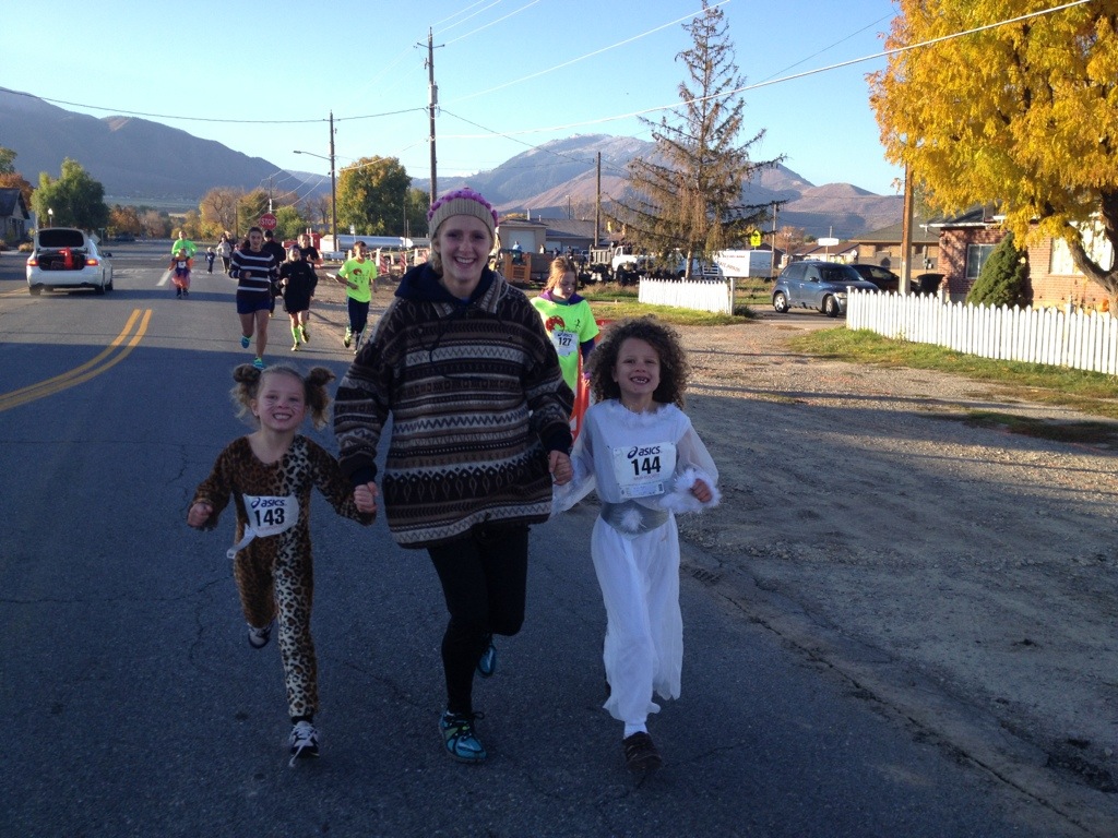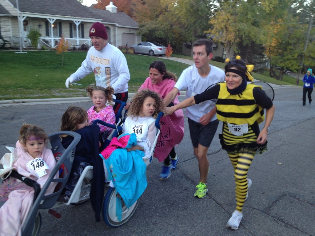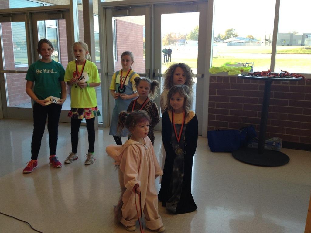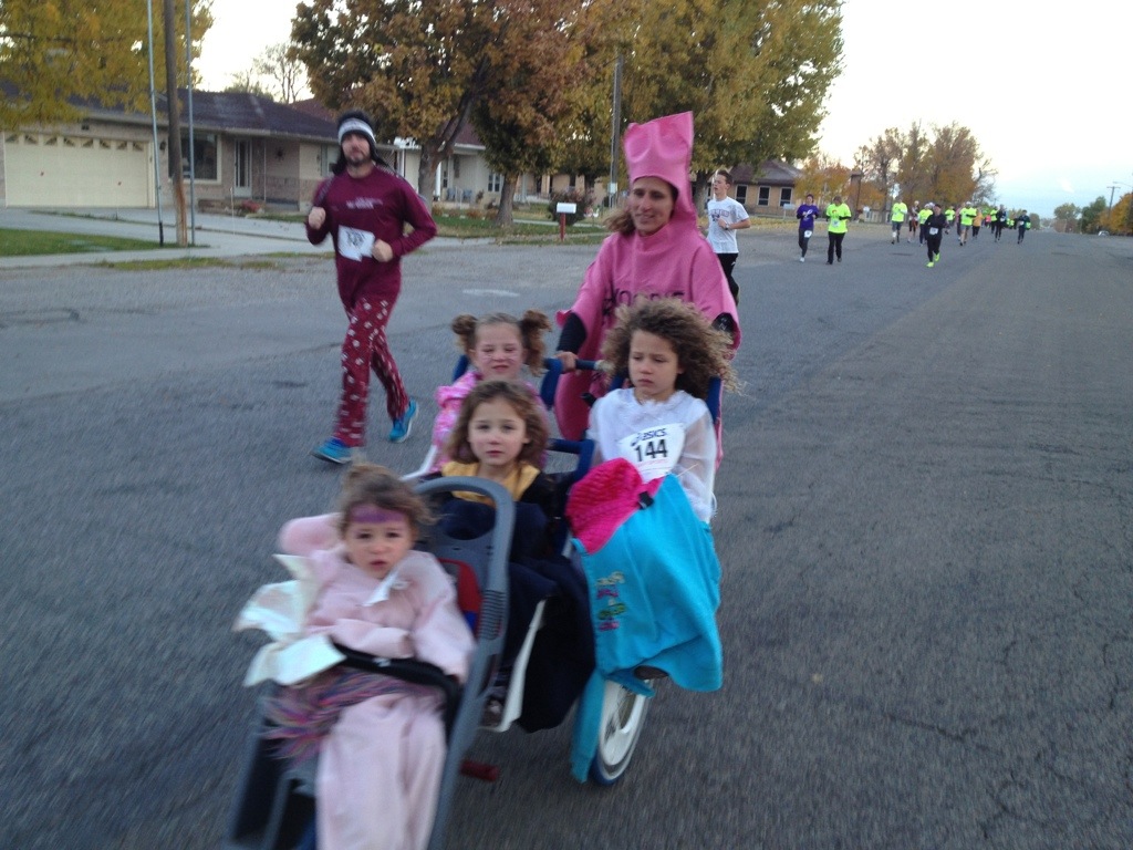 Here at the high school, the cross country team put on a Halloween 5K community fun run. We had a good turn out this year. I ran it this time with my girls. I usually work the finish line but we had enough helpers that I was able to help Corom this year and push the girls. I had a blast but it was tough!!!