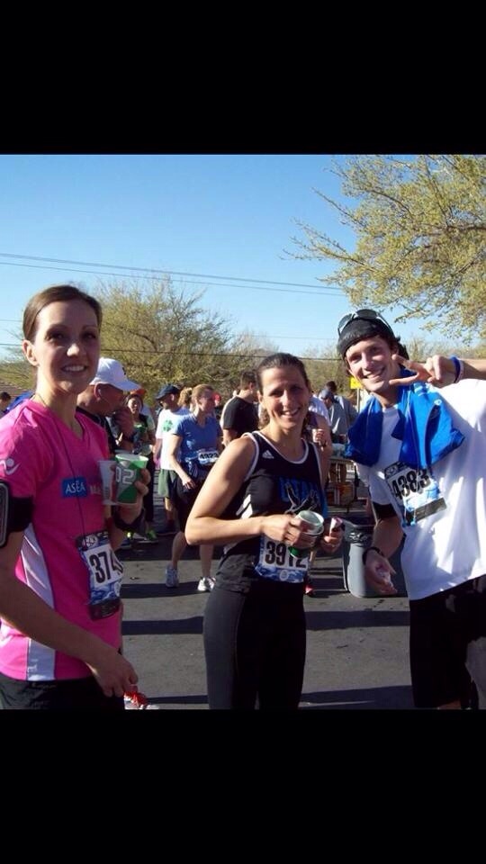 At mile 10, I saw the LDS missionaries, then I heard my name and saw 2 friends of mine from Utah. The Algers… They are serving their mission there too as a older couple. It was so exciting… She just sent this picture to me and my friend, Tifany… It was great seeing them! We made it back to our hotel by 4:30. Relaxed for a little while and then I headed to the lobby to get my free dinner. 🙂