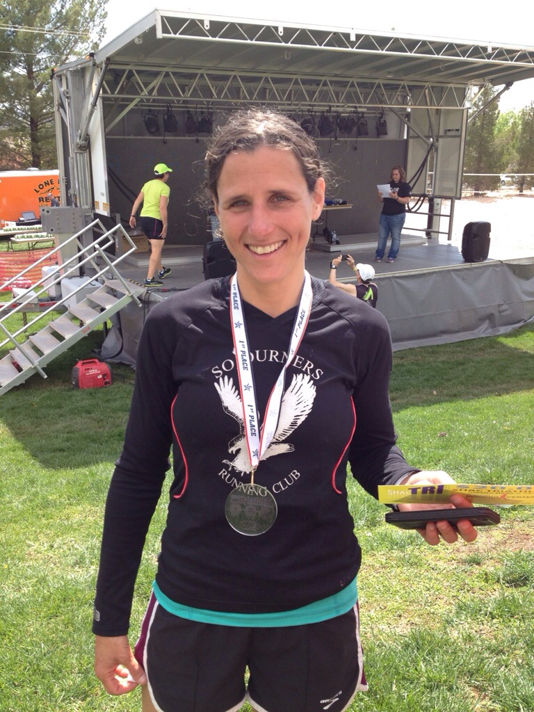 The race began and there were about 15-20 ladies in front of me for the 1st mile. We crossed the first mile and I looked at my watch… 5:30!!! Before I go on, it was a very aided mile downhill. Steep downhill! Miles 2 and 3 were also downhill with a few up (a rolling down)… Still fast and aided. I felt great and began to move up… That is when my competitive side took over. I can’t help it. 3 1/2 miles later we were out of the canyon and on the main road. I was in 3rd place now but didn’t think I could hold onto it. I was so winded by mile 4-4 1/2… The downhill took it out of my legs. 3 1/2 on was flat and up-hill and one short downhill close to the finish. I felt my endurance struggling! 🙂 I finished off with a time of 37:44 and I was able to hold onto 3rd. I was tired!!! I went on a 13 minute cool down. My legs were shot and so sore. But I am glad I was able to run this race.