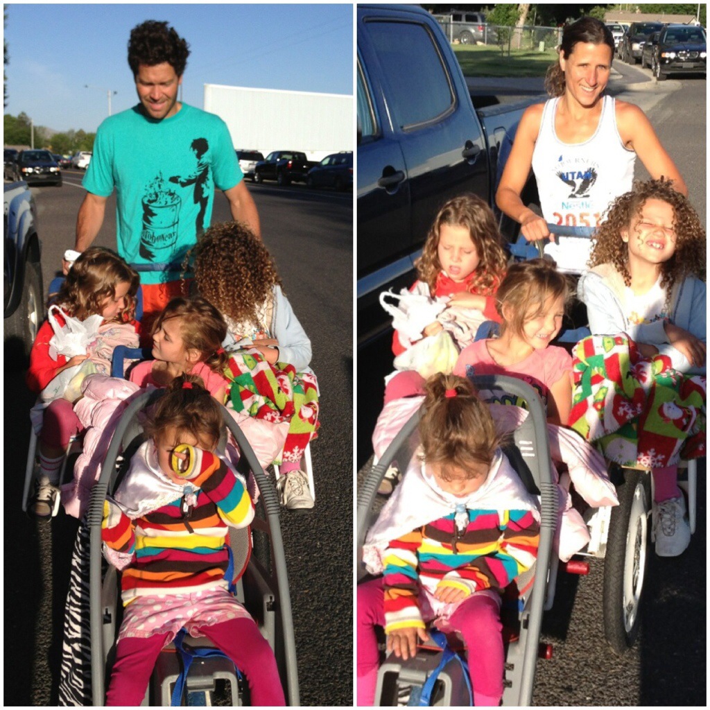 There was one part in the race that had a steep hill… I was a little ahead of Corom and Mike going into the hill. I got to a point that I had to walk pushing all 4 kids and then 10 sec later, I couldn’t push anymore (it was so steep). I think Corom and Mike stayed back on purpose to have a good laugh. Well next thing I knew I had a few people helping me (and we still had to walk even with 4 of us). It was quite the sight…