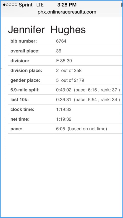 I came in at 26.47 miles in 1:50:52. Not what I wanted at all but it was a good fight. The beauty of this entire race… I went into it as a 40 year old and ended up winning the masters age group! Kara Goucher started the race (she is 40 as well) and was unable to finish… so I took 1st. I won money and was so stoked about it. There were 33,000 runners and majority of the field were women.