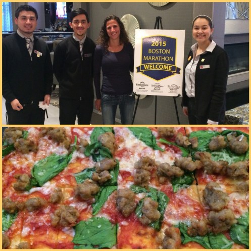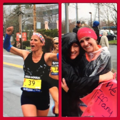 My kids were so excited to see me! (I made it again on the news for high fiving the crowd… It’s only about 5 seconds after the lady newscaster talks but I made it on. 🙂 http://m.wcvb.com/news/despite-rain-thousands-cheer-on-boston-marathon-runners/32471628.) It was completely silent the last 30 seconds before the start! You could feel the nerves and the excitement in the air around us. It was a feeling I have never experienced before (but now that I have… I want to more!) The gun went off and I immediately fell back into the back pack and just stayed there for the 1st 5k. I met #32, Kris… She is in the same boat as me. Injured but wanted to experience the whole elite marathon thing. Her and I ran together for the 1st half, after the 1st 5k, we slowed our pace down and set in comfortabley at a 7 min pace (sometimes faster and sometimes slowing down a bit)… She had to slow down a few times so I would turn around and go back for her. At about mile 14 I decided to go ahead, but we had a blast together. I had more fun during this marathon than any other race! It was electrifying… The crowds, the racers… Everything! I high fived people pretty much 21 miles out of the 26.2 and then the last 5, I had to save my energy just to finish. It was cold and rainy with wind gusts up to 30 mph (a head wind). But I was glad to be running and it didn’t stop the spectators from coming out! I was afraid to be “alone” (the rest of the race doesn’t start until 10, so we had a 28 minute head start)… But once we started that fear quickly left… I loved it. My calf would tighten up on many different occasions but my mind was focused on everything else around me. The people made it so great and enjoyable!