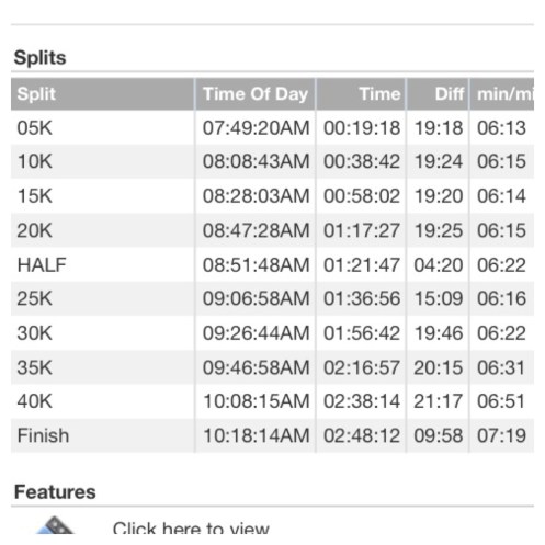 When I hit mile 24.45 on my garmin, I noticed on my right that there was a flag saying mile 24. I was a little confused and then in that split second I got so discouraged because I thought I only had a mile and a half left (and I knew I would have been close…the last few miles I did slow my pace down 20-24); I realized then that my garmin was off . I ended up running 26.7 (on my garmin, whether it was correct or not) I thought I was closer than what I was. Once I realized I was .5 over on my garmin at mile 24, I just knew that physically I would not be able to make that time up. 😕 The crazy thing was… Everyone around me all had our garmins going off at the same time… And it showed that we were on pace. None of us took in that with all the tall buildings our garmins would be thrown off. (That’s the only thing I can think of.) I should have known that I felt too good to be hitting the times the entire way. At mile 24 there was the clearing of no buildings. But on that point, who knows if I could have held on to the 6:10 pace for that long to the end… It is what it is… This is what my chip report (the official race report) had: